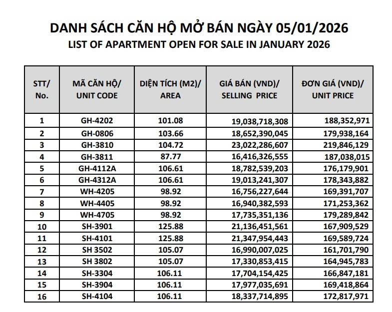 * Căn hộ 2PN (DT: 88m² – 99m² – 105m² – 110m² – 112m²): Giá bán từ 12 – 14 – 20 tỷ (tùy diện tích, view và layout)