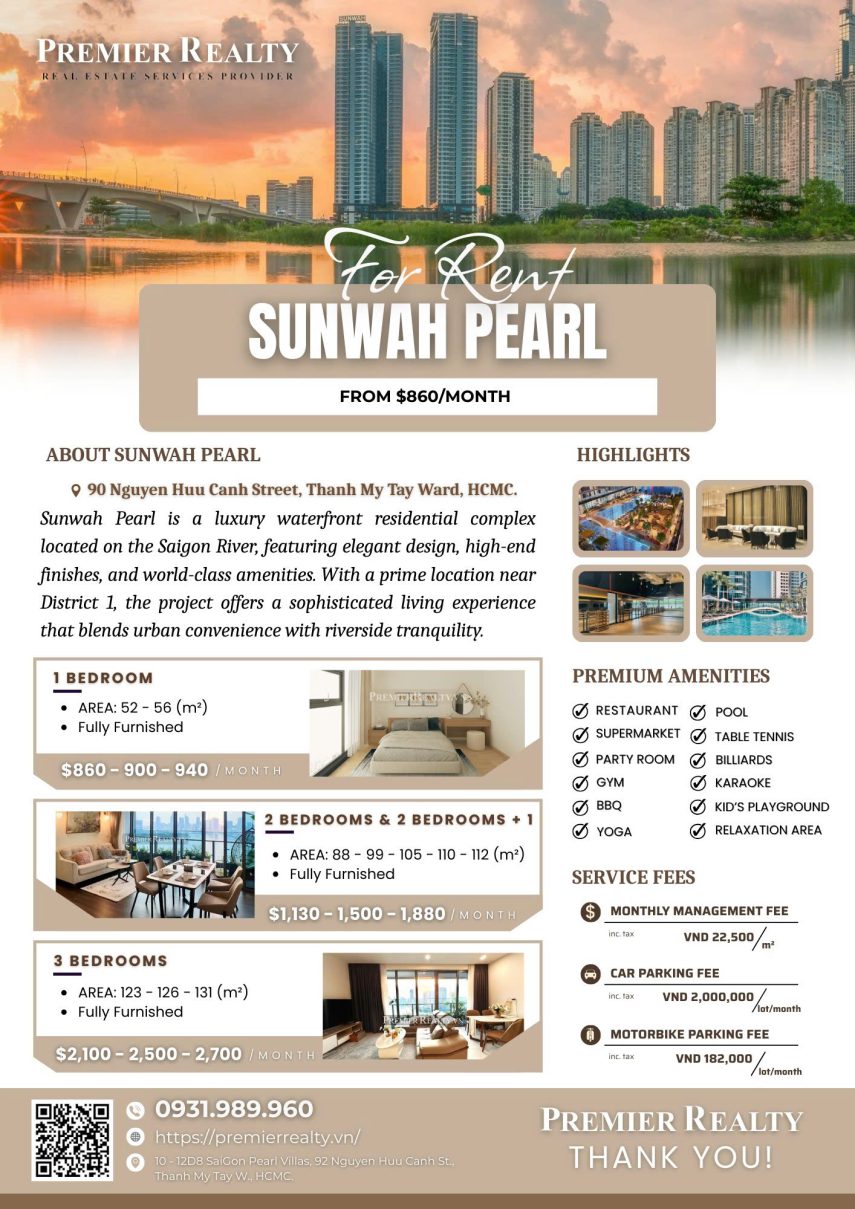 Cho thuê căn hộ Sunwah Pearl 2PN và 2PN+1: 88 – 105 – 106 – 112m2.
